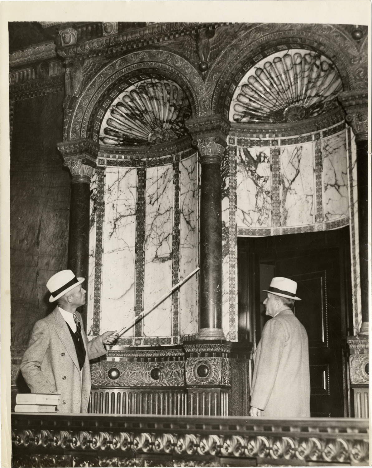 View of Wilbert Garred and Peter Wiggle examing marble niches in Detroit Post Office and Federal Building. One man holds a yardstick. Handwritten on back: "Old P.O. building. Wilbert Garred and Peter Wiggle in former courtroom at Tuttle's. Photographer: Gene Holland."