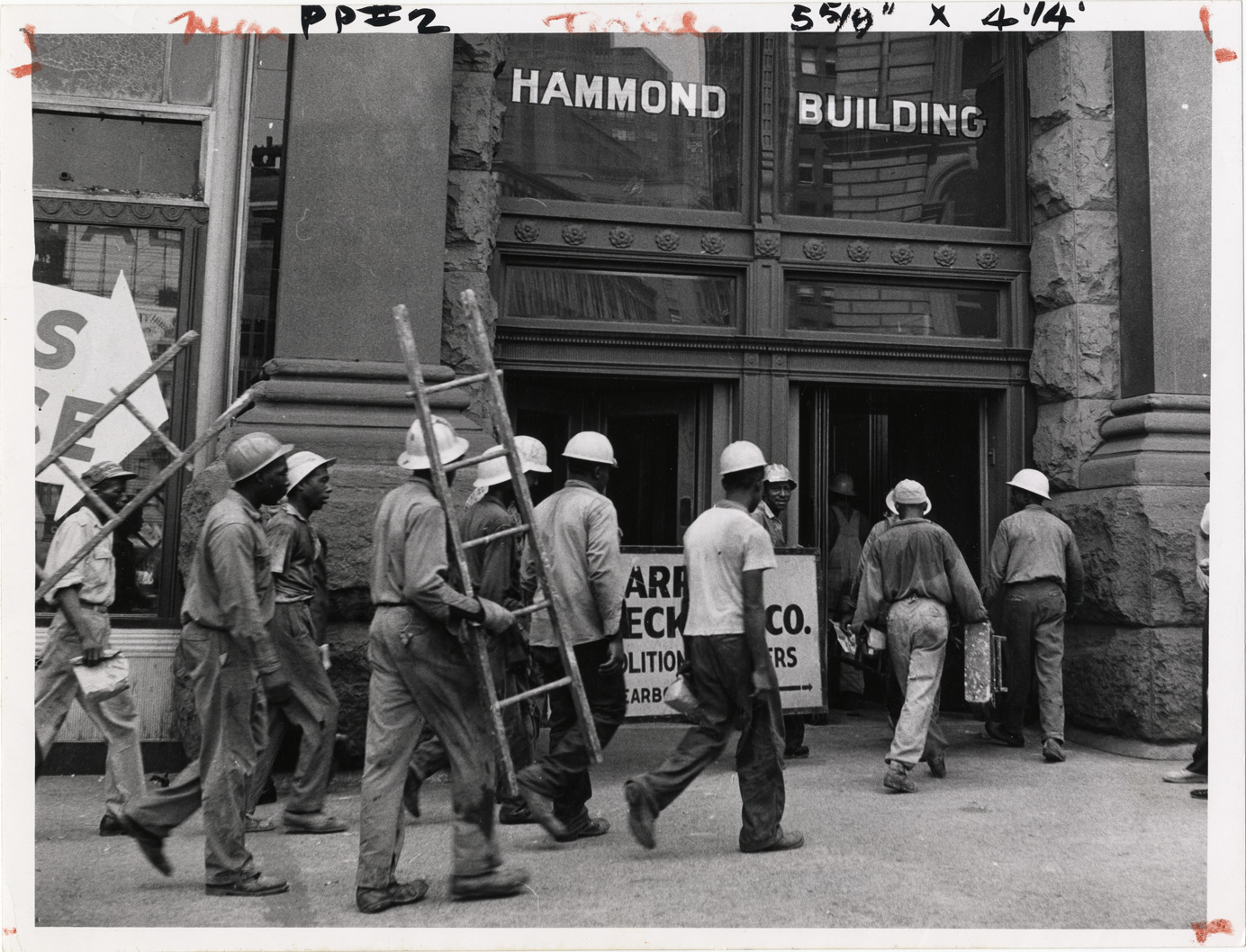 View of construction workers, wearing hard hats and carrying ladders, walking into entrance of Hammond Building. "Hammond Building" painted on glass above doorway. Stamped on back: "Free Press photo, photo by Tony Spina, 1956." Handwritten on back: "Hammond Bldg."