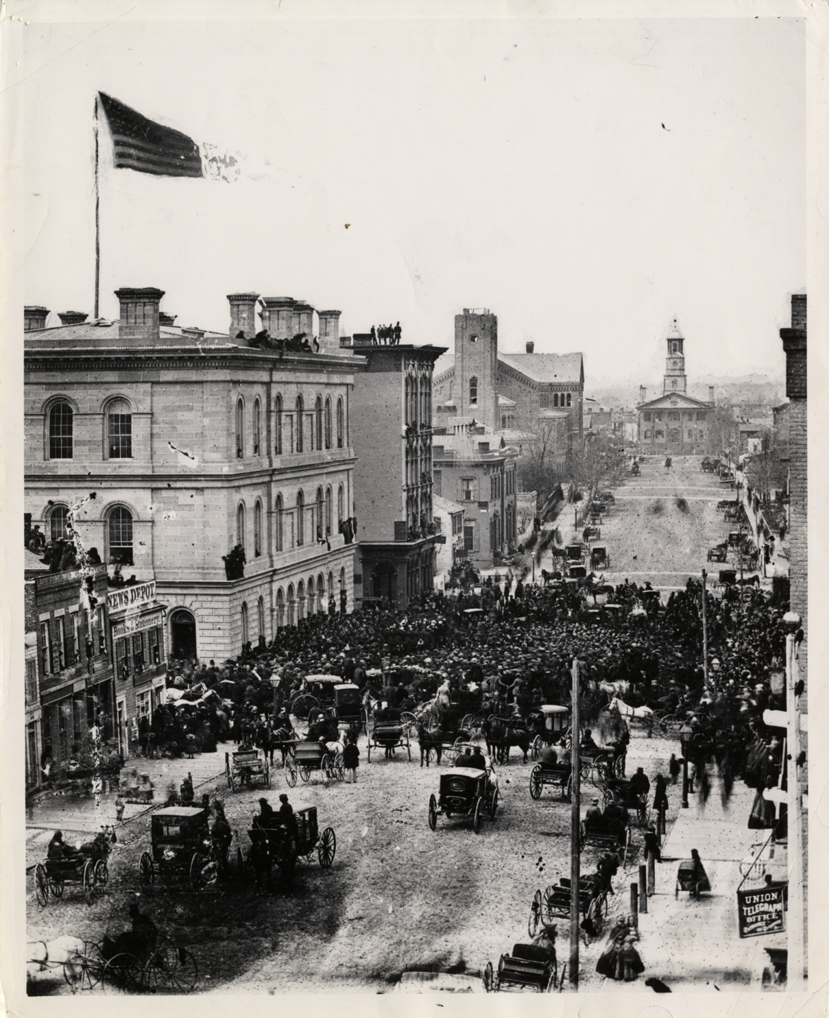 View of large crowd gathering at the Federal Post Office building at the corner of Larned and Griswold on April 20, 1861 to hear speeches and declare an oath of allegiance after President Lincoln calls for troops to defend the Union. Horse-drawn carriages on street in foreground. Handwritten on back: "History-Civil War. Photographer, Jex Bardwell."