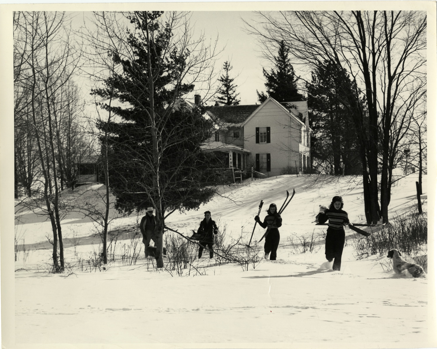 View of actor Brace Beemer, dressed as the Lone Ranger, outdoors on a winter day with teenage son, daughters and two dogs. Girls hold skis; wooden-frame house in background. Stamped on back: "Photo by Howard Greeter, 309 W. Jackson Blvd., Wabash 8550, Chicago." Handwritten on back: "Beemer, Brace, 1903-1965."