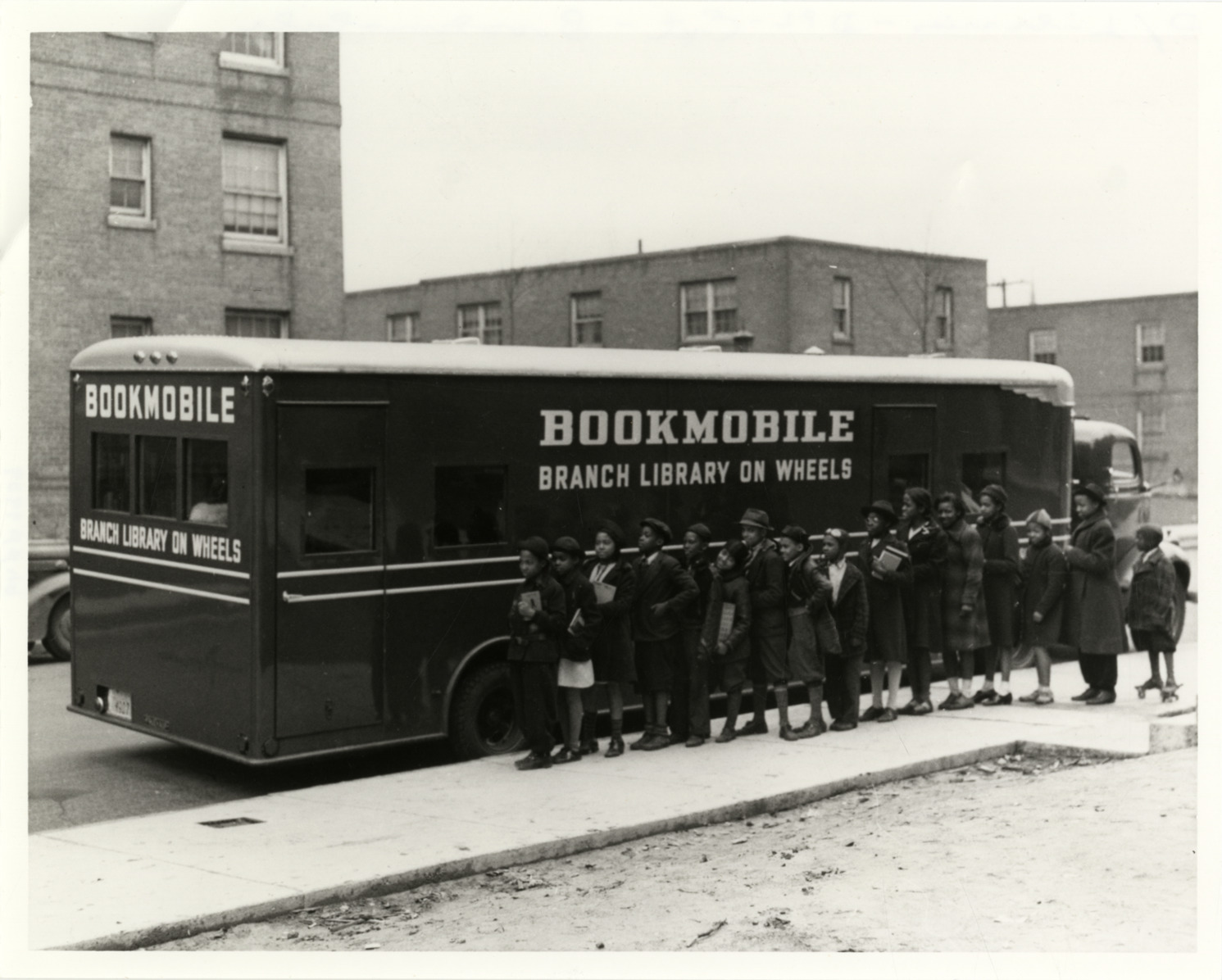 Favorite this☆ Children lined up in front of Detroit Public Library bookmobile Description: View of children in queue in front of the Detroit Public Library bookmobile. "Bookmobile, branch library on wheels" is painted on side of vehicle. Details Resource ID: bh009939 Subject: Bookmobiles--Michigan--Detroit Detroit Public Library African American children--Michigan--Detroit Photographic prints Date Issued: Unknown year Format: 1 photographic print ; 8 x 10 in. Member of: Burton Historical Collection Filing Location: D/Libraries-DPL-Branch Services-Bookmobile Rights: Physical rights are retained by DPL. Copyright is retained in accordance with U.S. copyright laws.