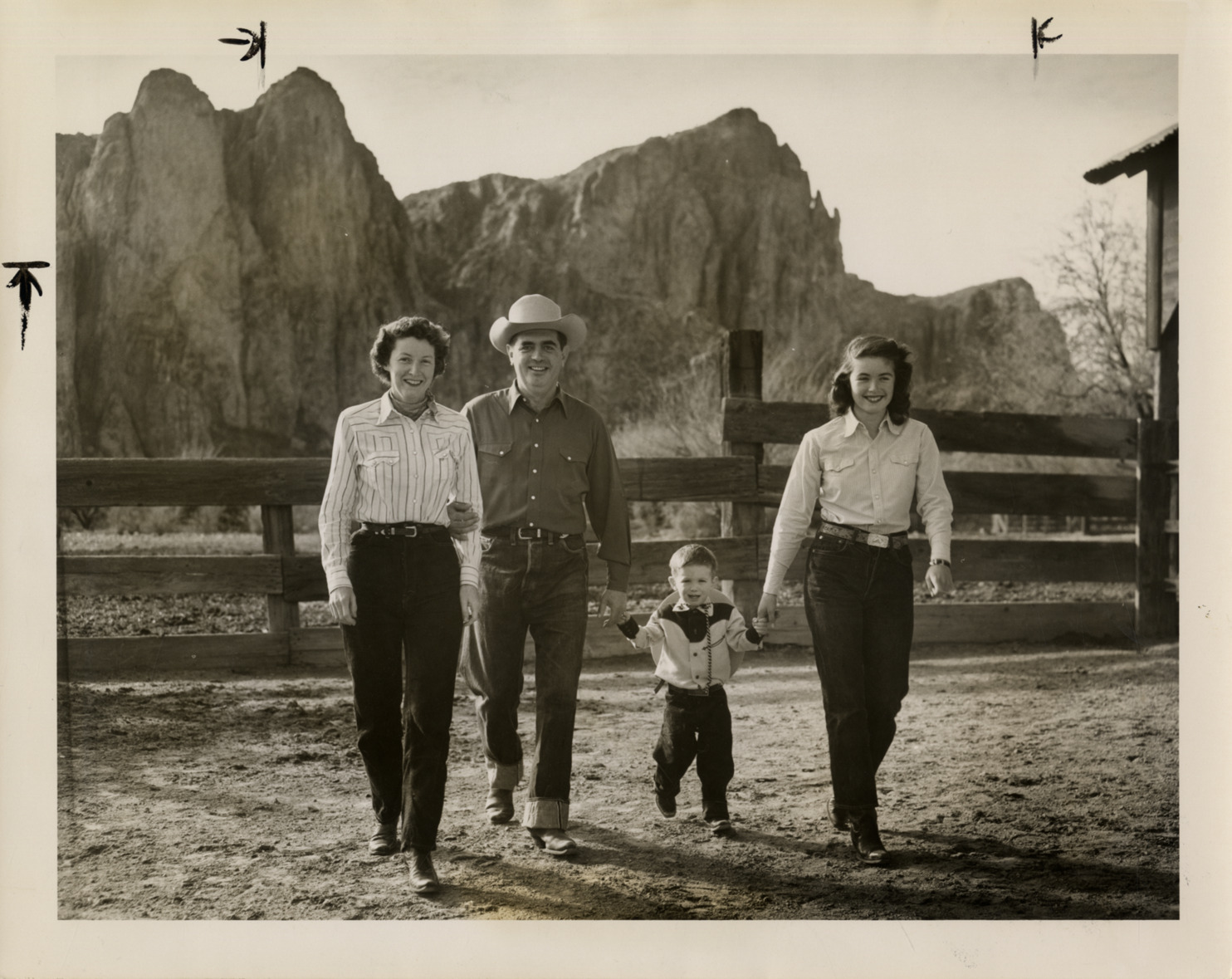View of Mr. and Mrs. Emery B. Hatch with son Bobby and daughter Peggy at the Sahuaro Lake Ranch in Mesa, Arizona. Family is dressed in Western style clothing; wooden fence and mountains in background. Caption on back: "Real westerners now are former Detroiters Mr. and Mrs. Emery B. Hatch, their son Bobby and daughter Peggy. Their home now is the Sahuaro Lake Ranch, Mesa, Arizona." Handwritten on back: "Mr. and Mrs. Emery B. Hatch, Bobby and Peggy, 2/18/50."