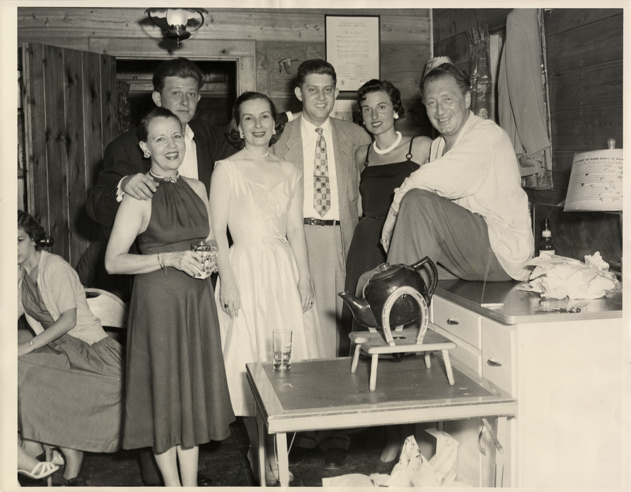 Favorite this☆ Brace Beemer and guests at party Description: View of actor Brace Beemer posing in kitchen with men and women dressed in cocktail attire, probably at a party. Teapot in horseshoe caddy on table in foreground. Handwritten on back: "Beemer, Brace, 1903-1965." Details Resource ID: bh009942 Subject: Beemer, Brace, 1903-1965 Portraits, Group Teapots Photographic prints Date Issued: Unknown year Format: 1 photographic print ; 11 x 14 in. Member of: Burton Historical Collection Filing Location: LB/Beemer, Brace Rights: Physical rights are retained by DPL. Copyright is retained in accordance with U.S. copyright laws.