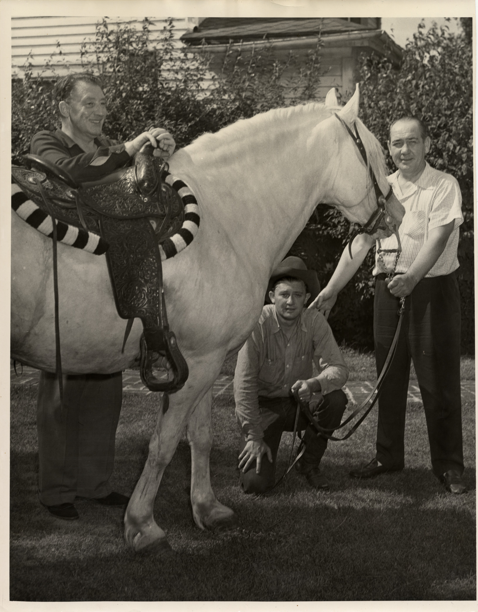 Favorite this☆ Brace Beemer posing with horse and unidentified men Description: View of actor Brace Beemer posing outdoors with horse and two unidentified men. Man crouching on ground wears a cowboy hat. Handwritten on back: "Beemer, Brace, 1903-1965." Details Resource ID: bh009944 Subject: Beemer, Brace, 1903-1965 Horses Photographic prints Date Issued: Unknown year Format: 1 photographic print ; 14 x 11 in. Member of: Burton Historical Collection Filing Location: LB/Beemer, Brace Rights: Physical rights are retained by DPL. Copyright is retained in accordance with U.S. copyright laws.