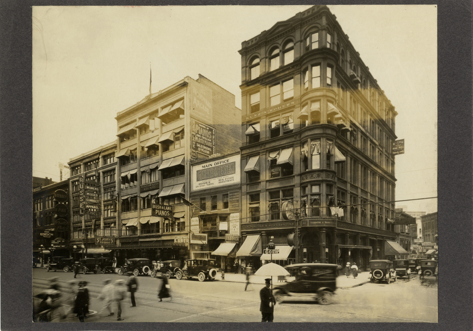 View of commercial buildings, including Gehrke & Jensen real estate offices, Kunz & Rogers jewelers and Bush & Lane pianos, on the northeast corner of Woodward Ave. and John R. Automobiles are parked in street; policeman in foreground. Typed on back: "N.E. cor. 1917."