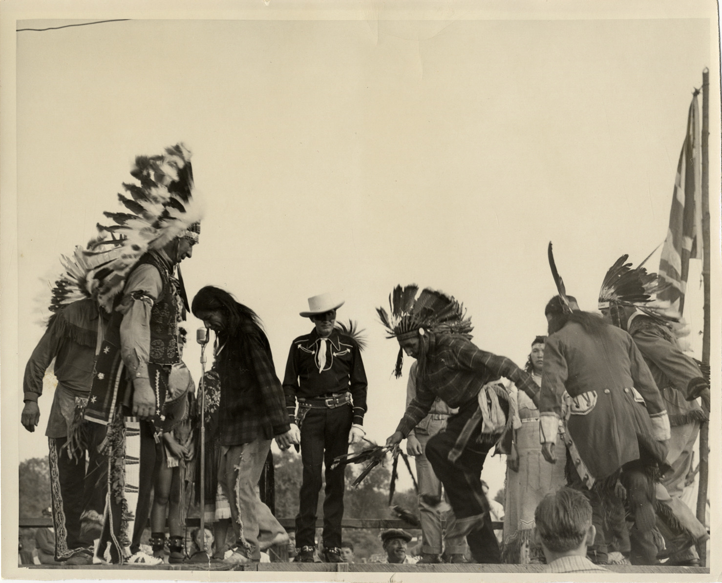 View of actor Brace Beemer, dressed as Lone Ranger, on a stage with Native American men dancing in circle. Several men wear headdresses. Stamped on back: "Photo by Ransier Studio, 457 West Fort St., Detroit." Handwritten on back: "Beemer, Brace, 1903-1965."