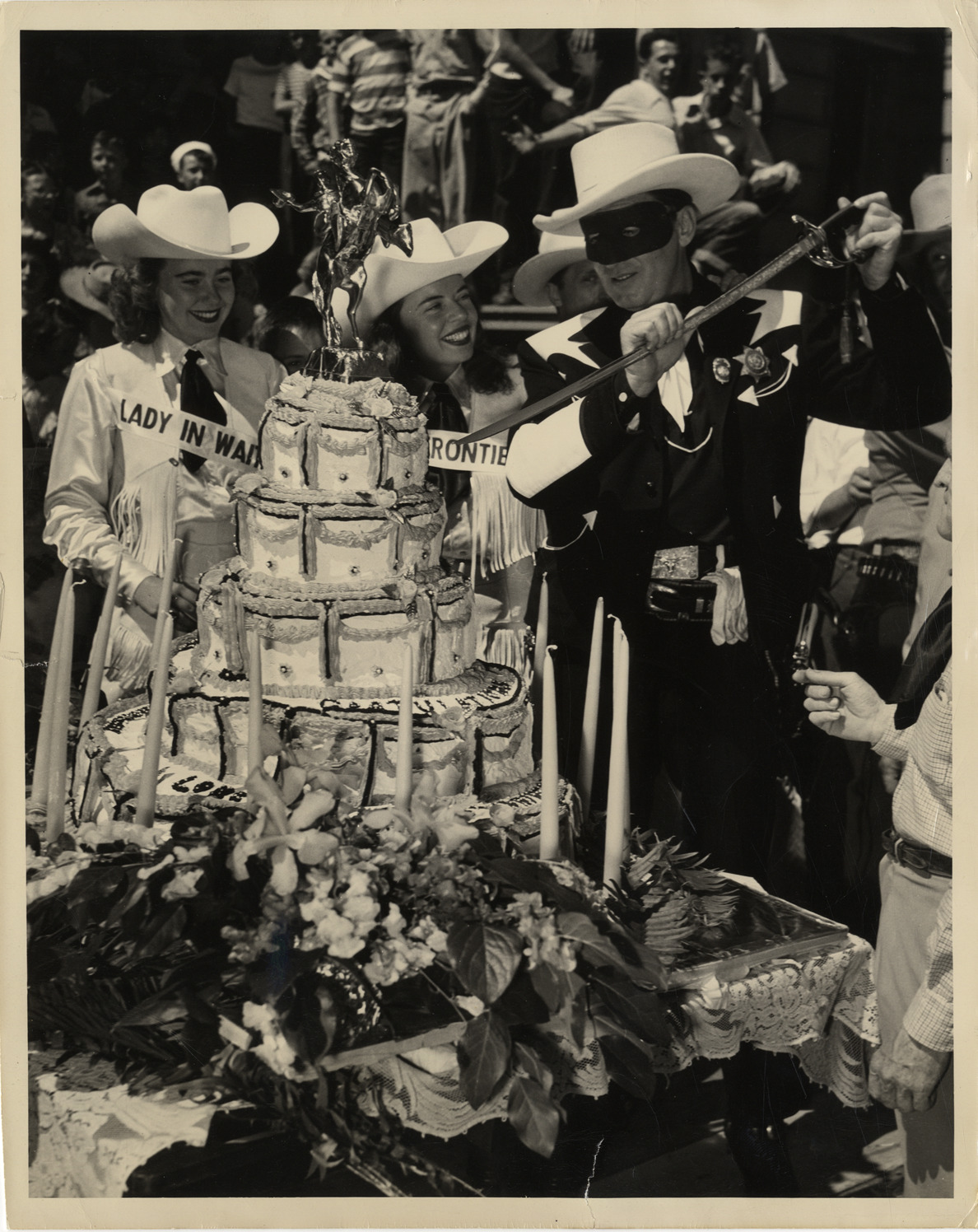 View of actor Brace Beemer, dressed as Lone Ranger, cutting decorated cake with sword. Two cowgirls, wearing sashes, stand next to Beemer. Cake is decorated with candles and figurine of cowboy on horseback. Stamped on back: "Look Magazine photograph." Handwritten on back: "Beemer, Brace, 1903-1965."