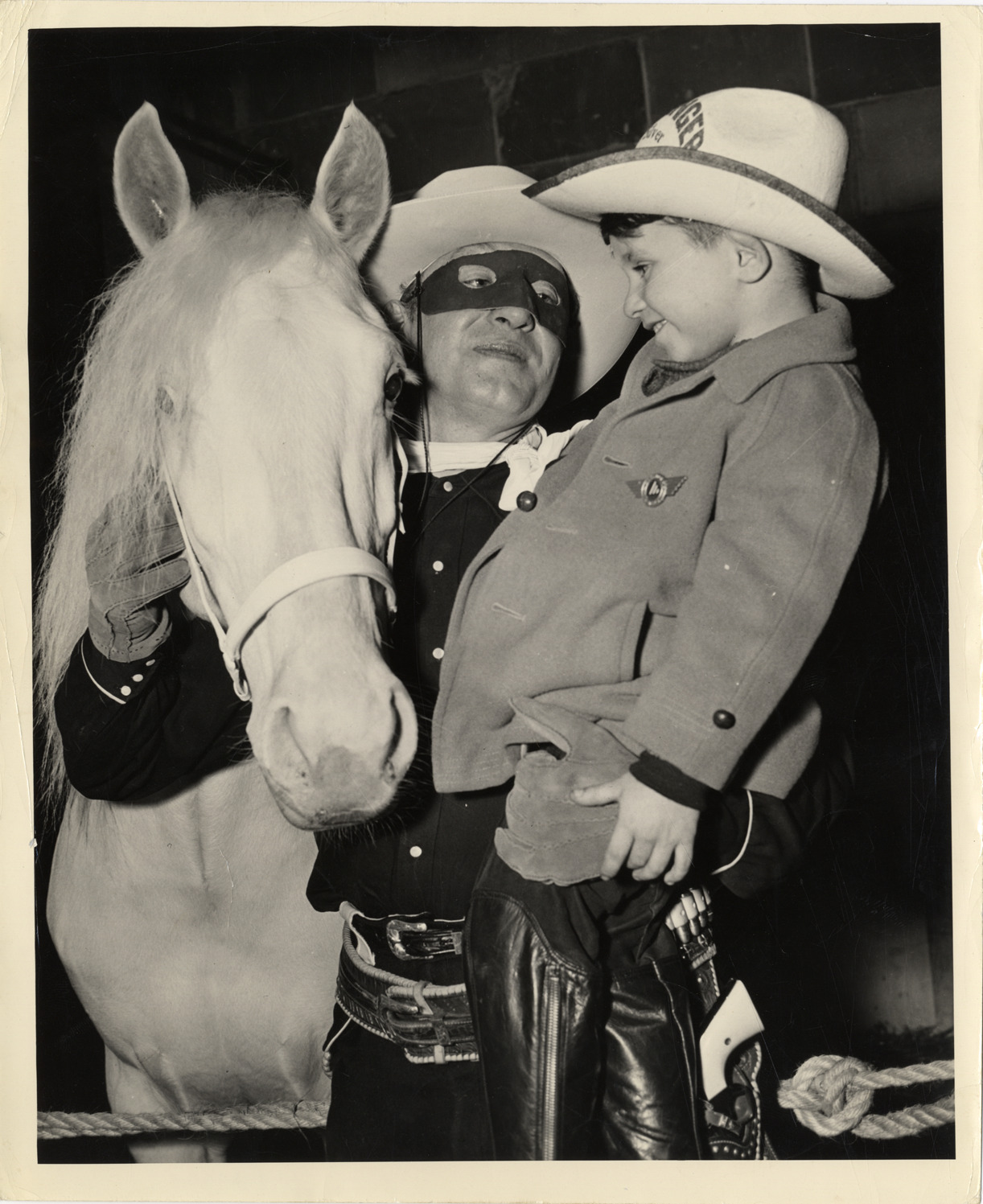 Brace Beemer, dressed as Lone Ranger, posing with boy and horse