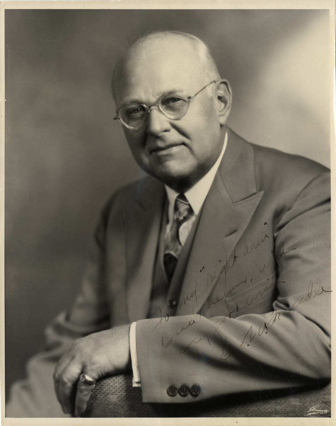 Portrait of George W. Trendle, creator of the Lone Ranger, autographed for Brace Beemer. Printed on front: "Craine, Detroit, Flint." Handwritten on front: "To my 'right arm' Brace Beemer, with every good wish, Geo. W. Trendle." Handwritten on back: "Trendle. Beemer, Brace, 1903-1965."