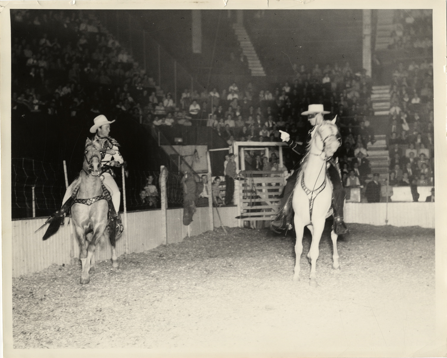 View of actor Brace Beemer, dressed as Lone Ranger, and cowboy on horseback in arena. Stamped on back: "Copyright photograph by Osman Playne. Address, P.O. Box 314, Montreal, P.Q., Canada. Telephone HArbour 2626, 24 hour service." Handwritten on back: "Beemer, Brace, 1903-1965."