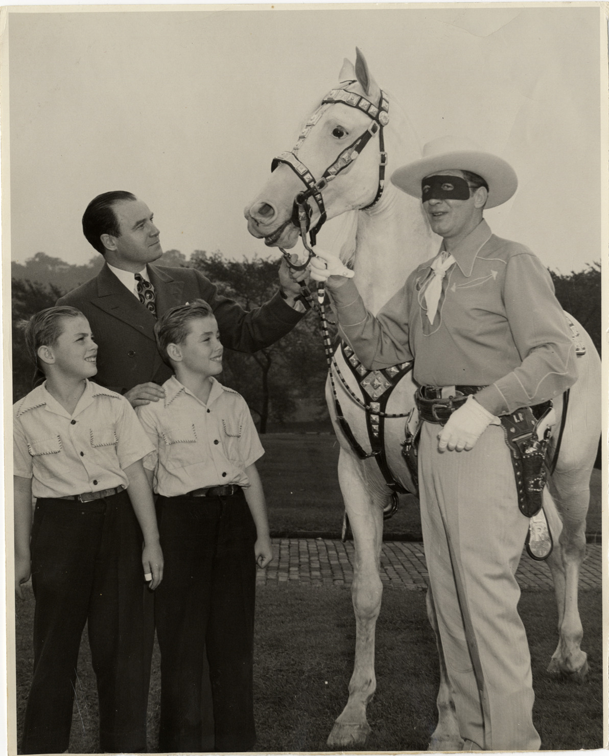 Brace Beemer, dressed as Lone Ranger, posing with man and two boys