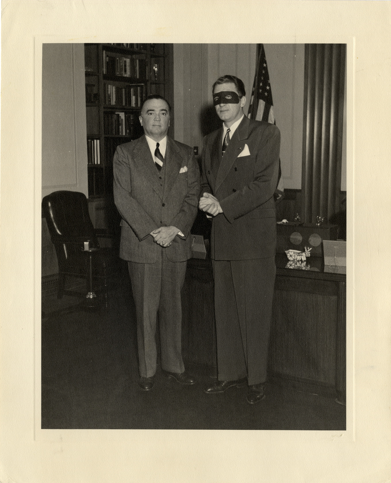 View of actor Brace Beemer, wearing Lone Ranger mask, posing with J. Edgar Hoover. Typed on back: "J. Edgar Hoover, Director, Federal Bureau of Investigation, greeting Mr. Brace Beemer, the Lone Ranger, on the occasion of Mr. Beemer's visit to the FBI on October 26, 1944." Handwritten on back: "Beemer, Brace, 1903-1965."