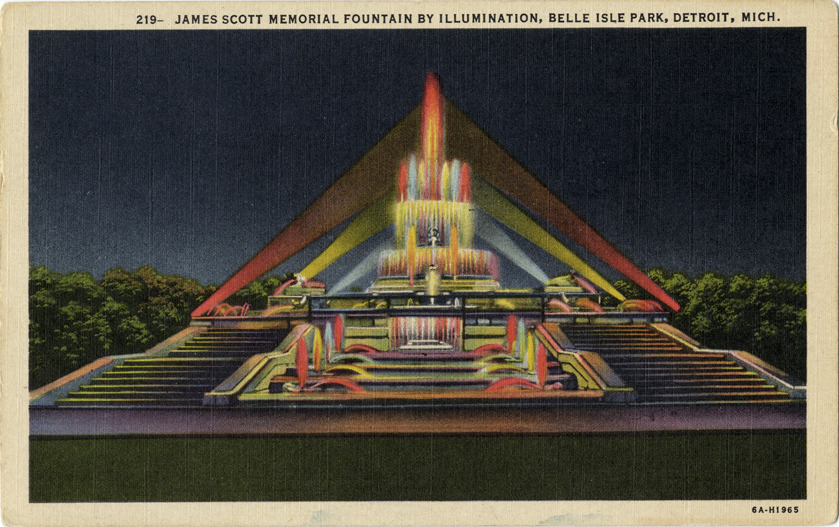 Nighttime view of the James Scott Memorial Fountain on Belle Isle. Printed on front: "219, James Scott Memorial Fountain by illumination, Belle Isle Park, Detroit, Mich." Printed on back: "The James Scott Memorial Fountain, Belle Isle, was erected at a cost of $500,000. The fountain consists of four basins, with aquatic figures forming the art work in the center. All during the summer season, the fountain is illuminated after dark through the use of a four-color light scheme. United News Co., 24 West Jefferson Avenue, Detroit, Mich. Genuine Curteich-Chicago 'C.T. Colortone' postcard (reg. U.S. Pat. Off.)" Handwritten on back: "Tues. eve, Febr. 7th. We received word this a.m. that you are in the hospital so am sending you a card to remind you that we are thinking of you. Laura B. is in Detroit for several weeks. Trust you are getting good care & will not need to stay long. Sympathy & best wishes from Mary C. Dorward & Mrs. Spencer. Read Psalm 121:1-2. 1/2/ Erie." Card is postmarked February, 1956.