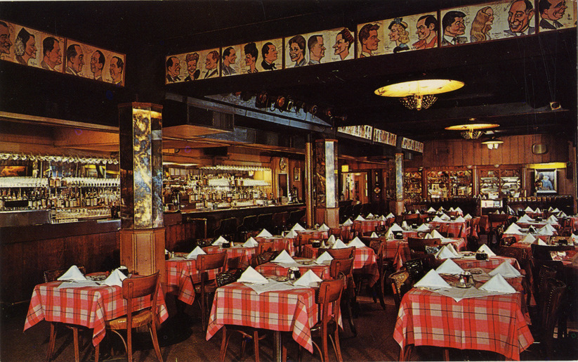 View of interior of London Chop House restaurant in Detroit, Michigan. Tables are set with checkered tablecloths; bar on left; caricacatures are displayed around perimeter of dining room. Printed on back: "London Chop House, 155 W. Congress, Detroit, Michigan. Dexter Natural Color, Pub. by Olsen Photographic, Detroit 12, Mich." Stamped on back: "Color post cards photographed and published by Olsen Photographic, 11527 Jos. Campau, Detroit 12, Townsend 8-6230."