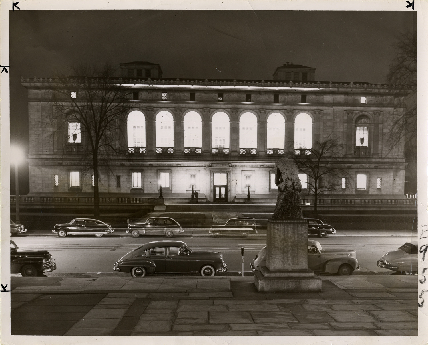Nighttime view of Main Library, Detroit Public Library on Woodward Ave., taken from the steps of the Detroit Institute of Arts. Rodin's Thinker sculpture in foreground; cars are parked in street. Label on back: "Few floodlights change the night appearance of the Main Library. Scene was taken from steps of Art Institute across Woodward." Stamped on back: "Free Press, Nov 4, 1950."