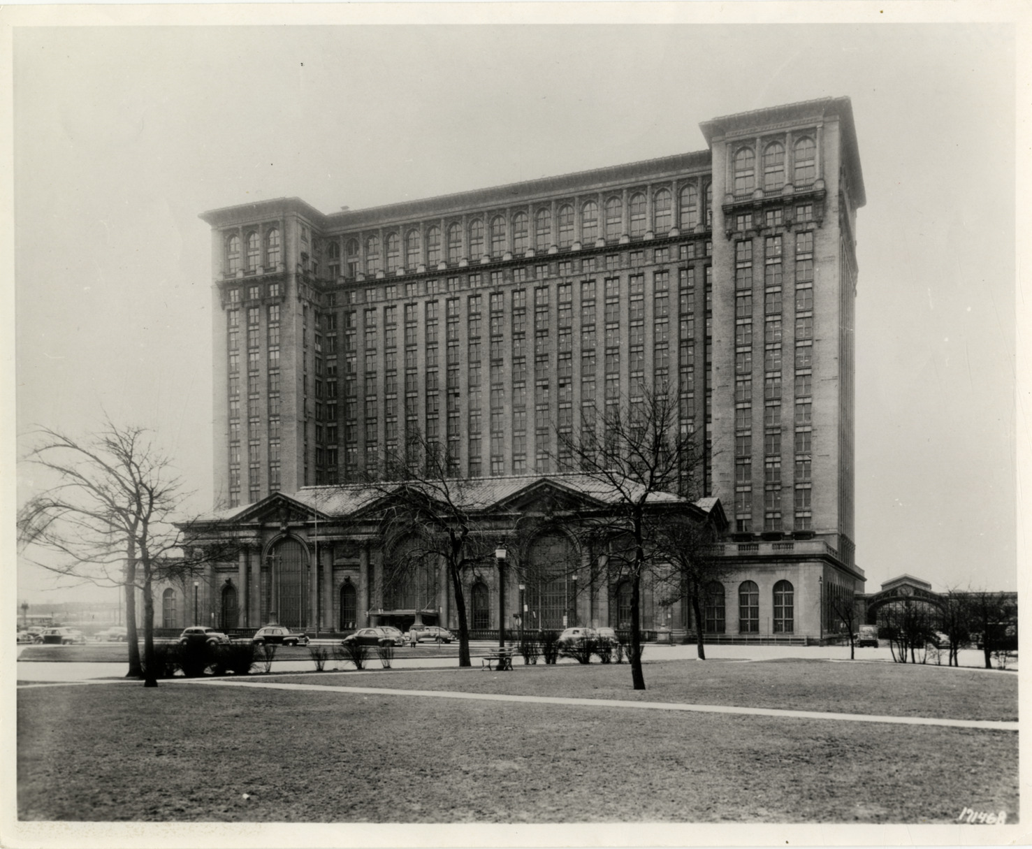 View of Michigan Central Railroad Station; automobiles parked in front of building. Typed on back: "12. Looking southeast at main entrance on north side of Michigan Central Station, April 1947. Credit: Manning Brothers Historical Collection. April, 1947." Stamped on back: "From the Manning Bros. Collection. Manning Bros. Commercial Photographers, 16300 Brush Street, Highland Park 3, Mich." Handwritten on back: "April, 1947. Photo no. 12."