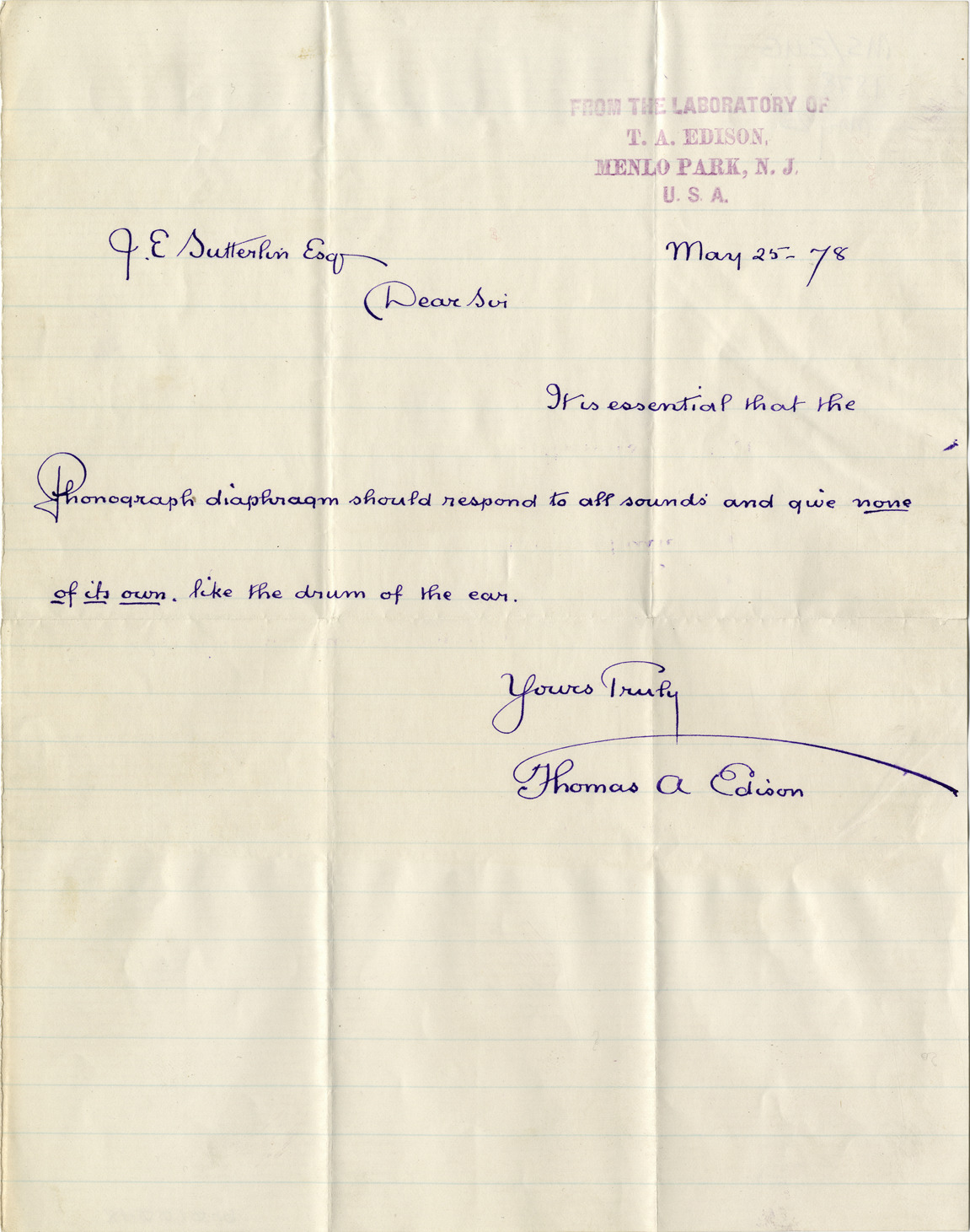 Letter to J.E. Sutterlin from Thomas A. Edison. Letter reads: "Dear Sir, It is essential that the phonograph diaphragm should respond to all sounds and give none of its own. Like the drum of the ear. Yours truly, Thomas A. Edison." Stamped on front: "From the laboratory of T.A. Edison, Menlo Park, N.J., U.S.A."