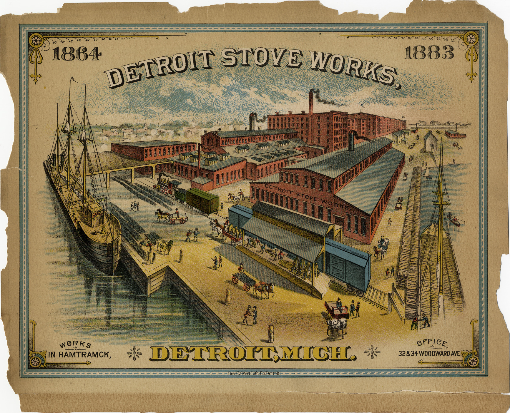 Advertisement for Detroit Stove Works, depicting factory adjacent to riverfront. Ships are moored to docks; horse-drawn wagons in foreground. Printed on front: "Detroit Stove Works, 1864-1883. Works in Hamtramck, Detroit, Mich. Office, 32 & 34 Woodward Ave."