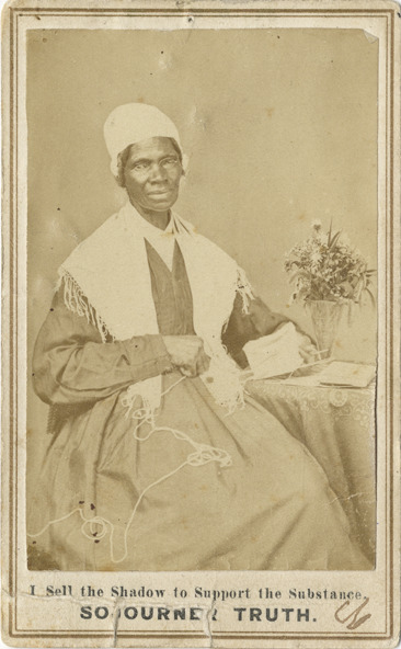 Portrait of Sojourner Truth, sitting next to table and holding some knitting. Vase of flowers is displayed on table. Printed on front: "I sell the shadow to support the substance. Sojourner Truth." Printed on back: "Entered according to act of Congress in the year 1864, by Sojourner Truth, in the Clerk's Office, of the U.S. District Court, for the Eastern District of Mich."