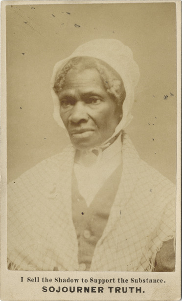 Portrait of Sojourner Truth. Printed on front: "I sell the shadow to support the substance. Sojourner Truth." Printed on back: "Entered according to act of Congress in the year 1864, by Sojourner Truth, in the Clerk's Office, of the U.S. District Court, for the Eastern District of Mich."