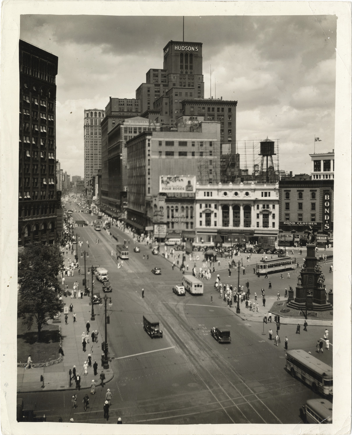 View of Woodward Ave. in Detroit, Michigan. Automobiles, buses and streetcars in street; pedestrians on sidewalk. J.L. Hudson's building and other commercial buildings in background. Soldiers' and Sailors' Monument on right.