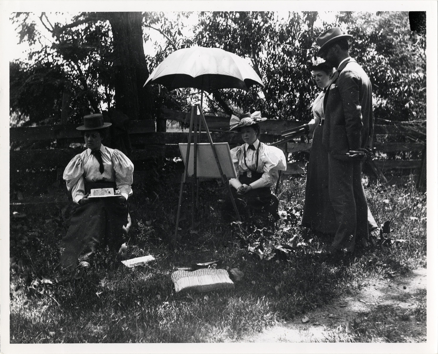 View of man and woman standing next to seated woman working at an easel outdoors; umbrella shades easel; another woman sits nearby; wooden fence and trees in background. Artist wears striped high-necked blouse with puffed sleeves and hat trimmed with ribbons.