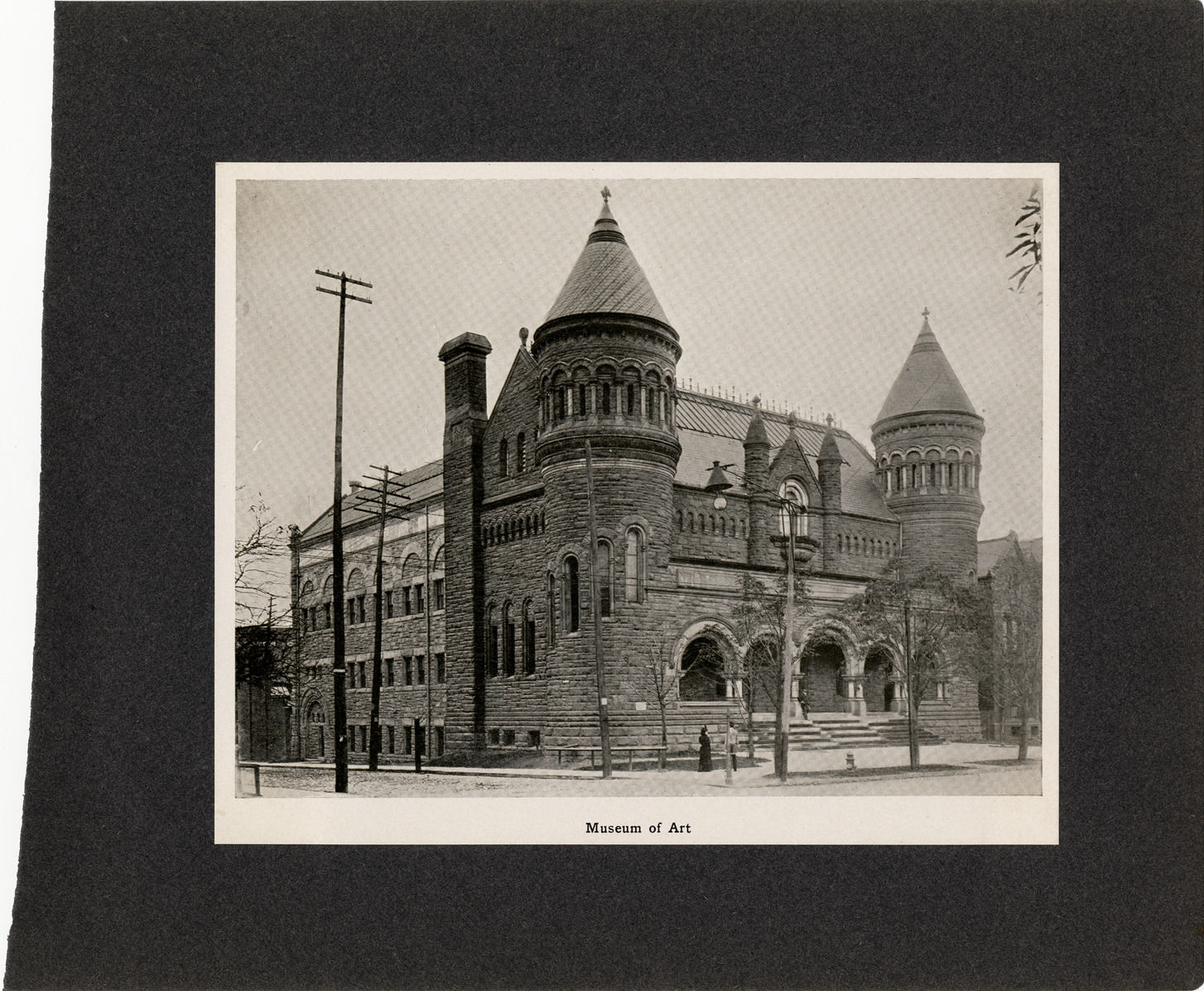View of the Detroit Museum of Art. Richardsonian Romanesque style building has turrets and an arched colonnade. Printed on front: "Museum of Art."