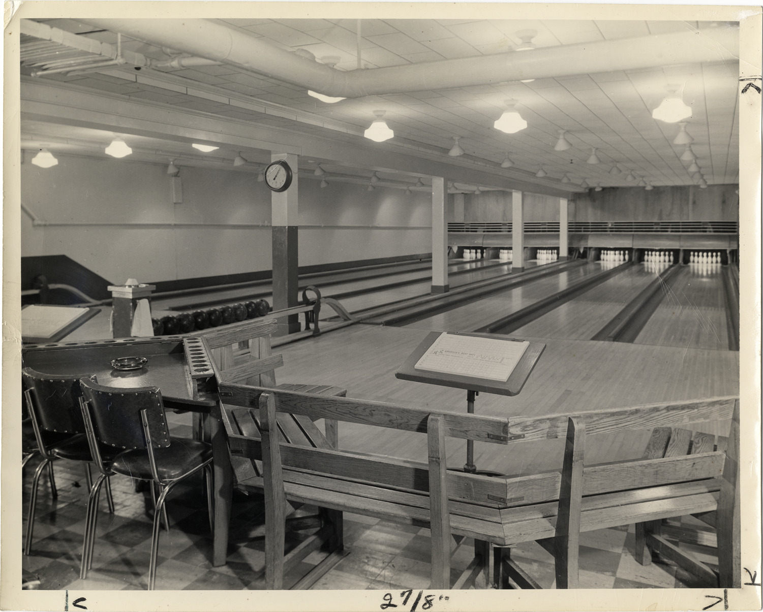 View of the bowling alley in the Harmonie Society building. Wooden benches and scorecard on stand in foreground; bowling balls are lined up in rack. Stamped on back: "Photo by Pherlo, 4100 Columbus Avenue, Detroit 4, Mich. TY. 4-6591."
