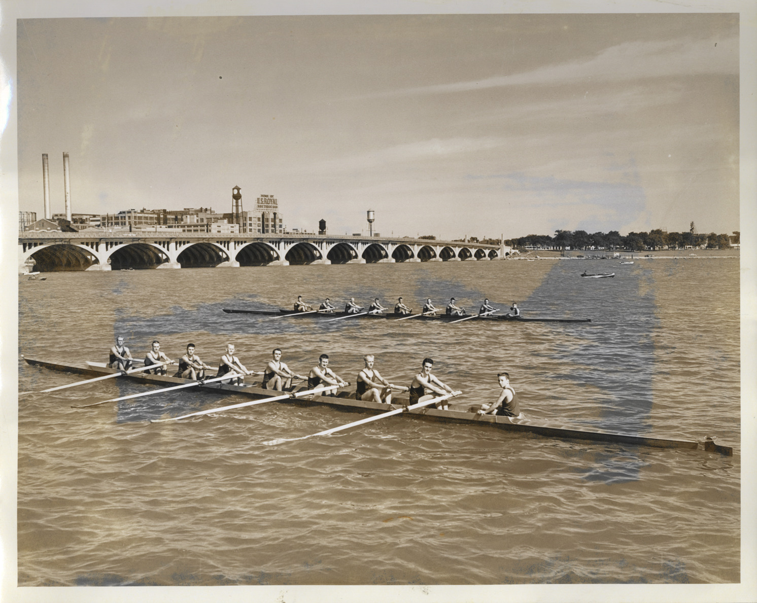 View of Detroit Boat Club oarsmen posing in two rowing sculls on the Detroit River. Belle Isle Bridge in background. Label in scrapbook: "N.A.A.O. championship, 150 pound eight, first & second. Number 2 crew (background). Bow, Mike Erneman; 2, Dave Saxton; 3, Roger Arbury; 4, Bob Nash; 5, Stan Stankovich; 6, Jim Plath; 7, Doug Inglis. Stroke, Larry Askew. Cox, Bob Kroll. Number 1 crew. Bow, Tom Bredt; 2, Jim Dreher; 3, Earl 'Buzz' Walke; 4, Al Arbury; 5, Oscar Marx; 6, Bill Thorpe,; 7, Marv Hopman. Stroke, Al Pierrot. Cox, Bob Pierrot."
