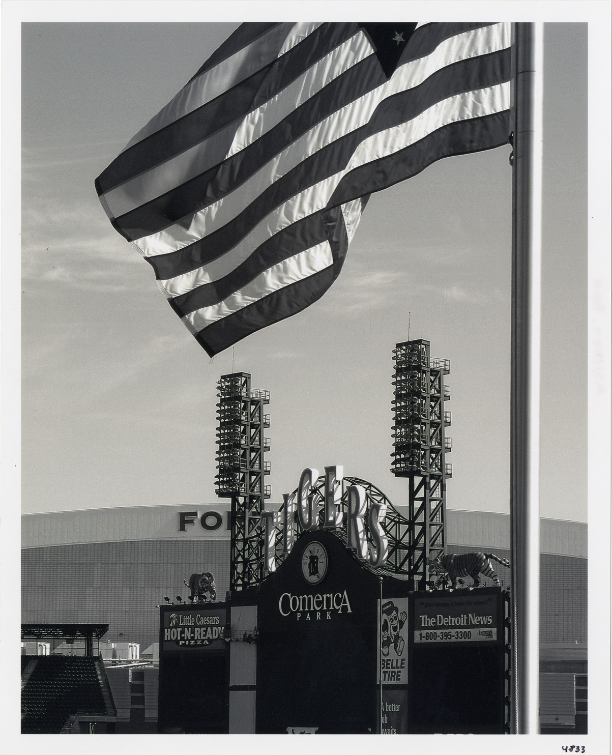 View of the scoreboard for the Detroit Tigers baseball team at Comerica Park. Advertisements for Little Caesars pizza, the Detroit News and Belle Tire and two statues of tigers are display on scoreboard. American flag in foreground. Label on back: "Comerica Park scoreboard, 3/07. Photograph by Bob Oren. www.detroit-photos.com. This image is for reference only. The duplication, copying, printing, scanning or any other reproduction of this photograph, in whole or in part, is strictly prohibited without the written authorization of the Detroit Public Library."