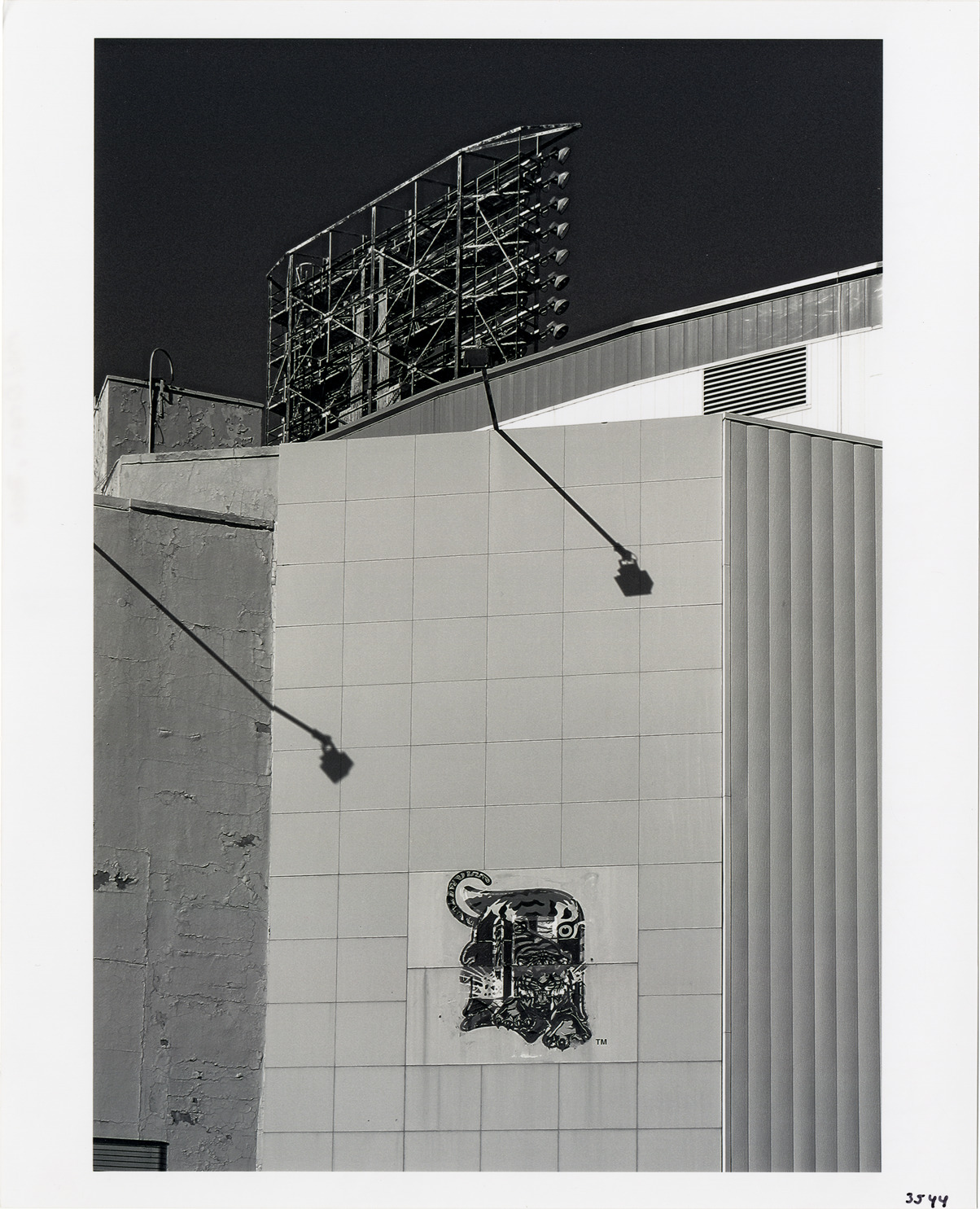 View of Detroit Tigers trademark, a tiger superimposed on an old English "D," displayed on the side of Tiger Stadium. Label on back: "Tiger Stadium logo, 9/06. Southeast facade, Michigan and Trumbull. Photograph by Bob Oren. www.detroit-photos.com. This image is for reference only. The duplication, copying, printing, scanning or any other reproduction of this photograph, in whole or in part, is strictly prohibited without the written authorization of the Detroit Public Library."