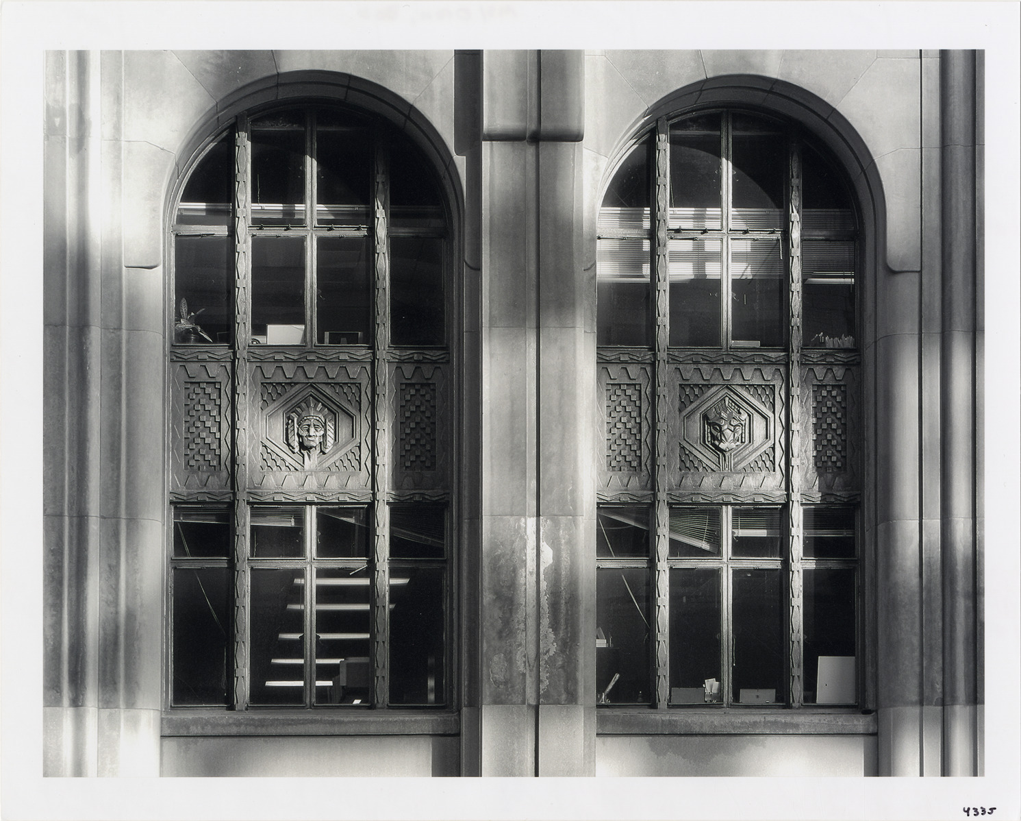 View of windows on north facade of Penobscot Building. Label on back: "Penobscot Building, north facade detail, 12/06. Architect: Smith, Hinchman & Grylls, 1928." Photograph by Bob Oren. www.detroit-photos.com. This image is for reference only. The duplication, copying, printing, scanning or any other reproduction of this photograph, in whole or in part, is strictly prohibited without the written authorization of the Detroit Public Library."