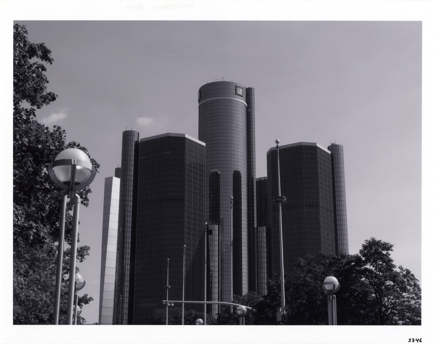 View of the Renaissance Center. Label on back: "Renaissance Center, 9/06. Architect: John Portman, 1977-81. Photograph by Bob Oren. www.detroit-photos.com. This image is for reference only. The duplication, copying, printing, scanning or any other reproduction of this photograph, in whole or in part, is strictly prohibited without the written authorization of the Detroit Public Library."