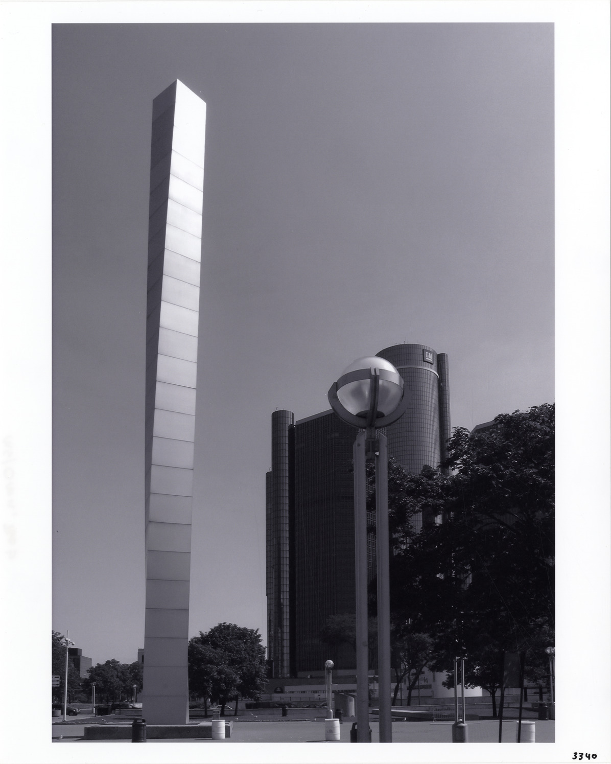 View of the Renaissance Center and Isamu Noguchi's sculpture, "Pylon." Label on back: "Renaissance Center and Noguchi's Pylon, 9/06. Architect: John Portman, 1977-81. Pylon: Noguchi, 1974. Photograph by Bob Oren. www.detroit-photos.com. This image is for reference only. The duplication, copying, printing, scanning or any other reproduction of this photograph, in whole or in part, is strictly prohibited without the written authorization of the Detroit Public Library."