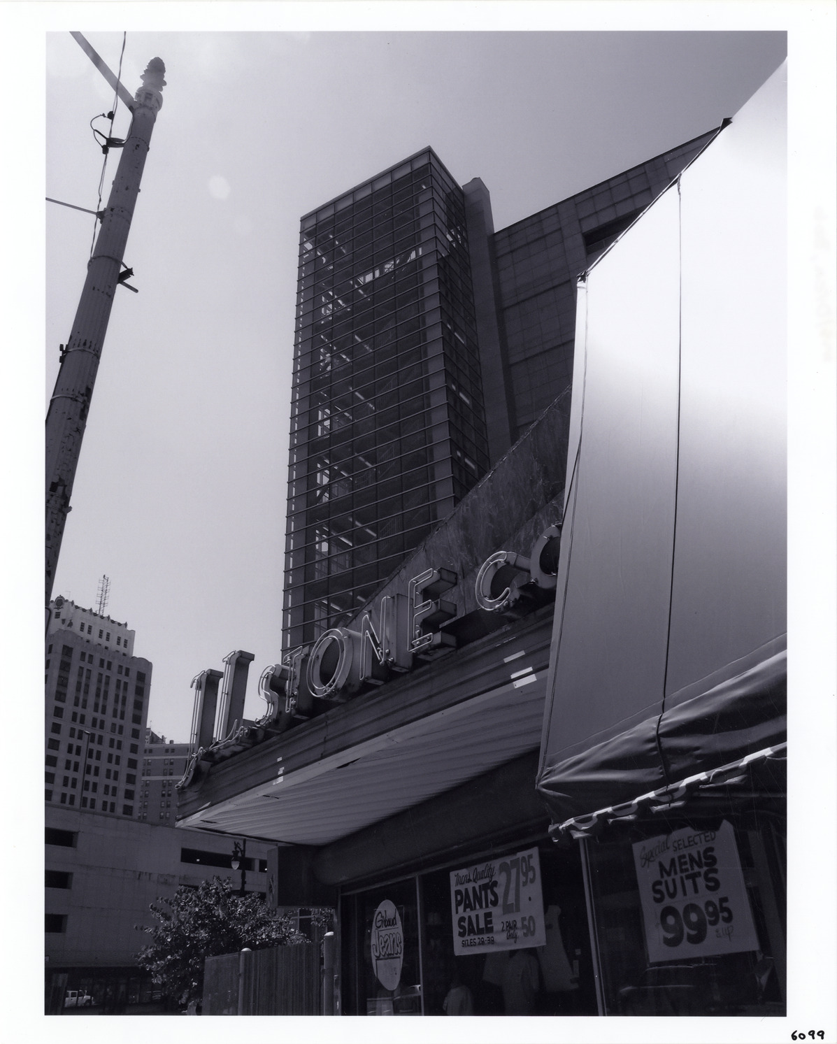 Close-up view of neon sign over entrance to the J.L. Stone Company men's clothing store, located at Gratiot Avenue and Randolph Street. Label on back: "J.L. Stone Co. 2, 7/07. Gratiot and Randolph. Photograph by Bob Oren. www.detroit-photos.com. This image is for reference only. The duplication, copying, printing, scanning or any other reproduction of this photograph, in whole or in part, is strictly prohibited without the written authorization of the Detroit Public Library."