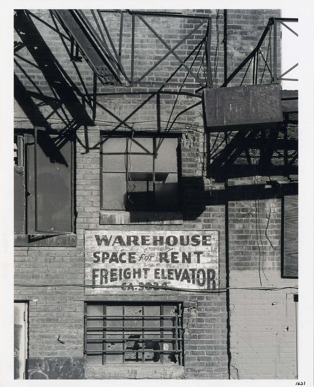 View of brick wall sign in alley behind warehouse, located at Broadway and Gratiot Avenue. Sign reads: "Warehouse, space for rent, freight elevator, CA. 9024." Fire escape overhead. Label on back: "Warehouse space for rent, 1/06. Alley behind Broadway at Gratiot. Photograph by Bob Oren. www.detroit-photos.com. This image is for reference only. The duplication, copying, printing, scanning or any other reproduction of this photograph, in whole or in part, is strictly prohibited without the written authorization of the Detroit Public Library."