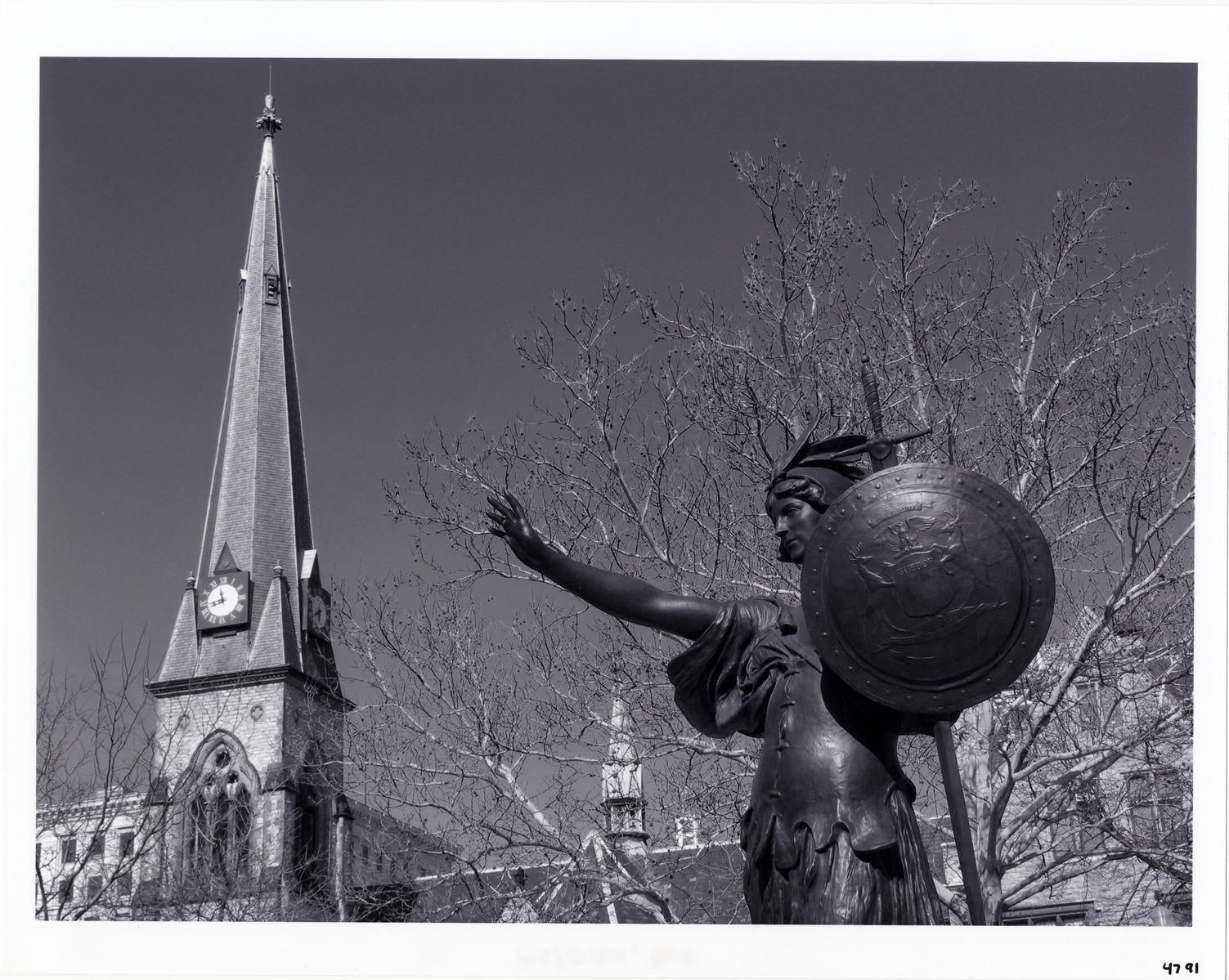 Close-up view of statue on the Russell A. Alger Memorial Fountain, located in Grand Circus Park. Fountain was designed by Daniel Chester French. Church steeple with clock in background. Label on back: "Russell Alger statue, Grand Circus Park, 1/07. Sculptor: Daniel Chester French. Architect: Henry Bacon, 1921. Photograph by Bob Oren. www.detroit-photos.com. This image is for reference only. The duplication, copying, printing, scanning or any other reproduction of this photograph, in whole or in part, is strictly prohibited without the written authorization of the Detroit Public Library."