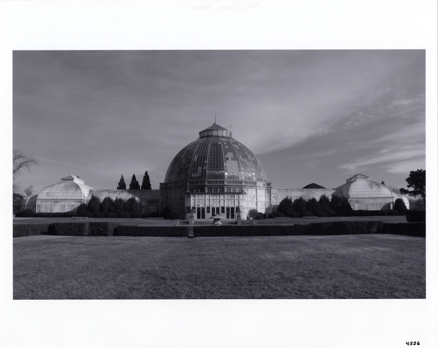 View of the Belle Isle Conservatory, named for Anna Scripps Whitcomb and designed by Albert Kahn. Label on back: "Anna Scripps Whitcomb Conservatory, 1/07. Belle Isle. Architect: Albert Kahn, 1904. Photograph by Bob Oren. www.detroit-photos.com. This image is for reference only. The duplication, copying, printing, scanning or any other reproduction of this photograph, in whole or in part, is strictly prohibited without the written authorization of the Detroit Public Library."