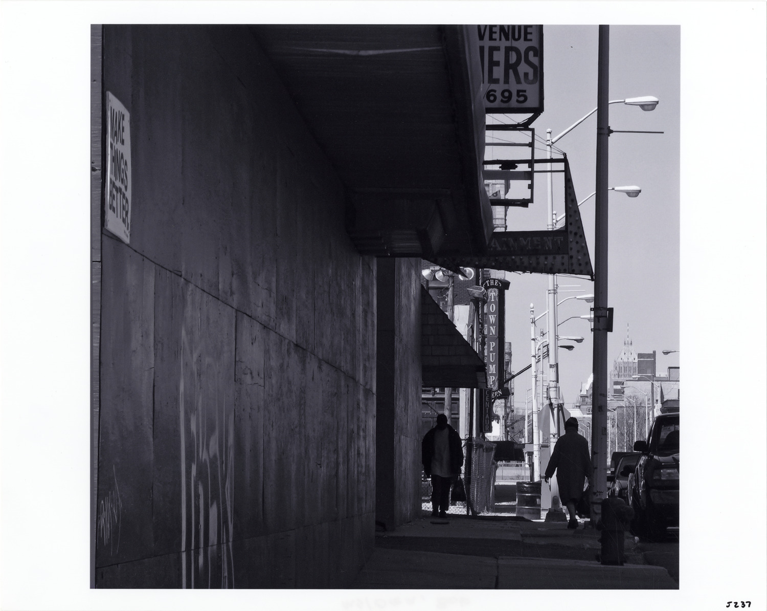 View of pedestrians walking on sidewalk near the Town Pump Tavern. "Make things better" sign is affixed to building in foreground. Label on back: "Make things better, 4/07. Park and Elizabeth Street. Photograph by Bob Oren. www.detroit-photos.com. This image is for reference only. The duplication, copying, printing, scanning or any other reproduction of this photograph, in whole or in part, is strictly prohibited without the written authorization of the Detroit Public Library."