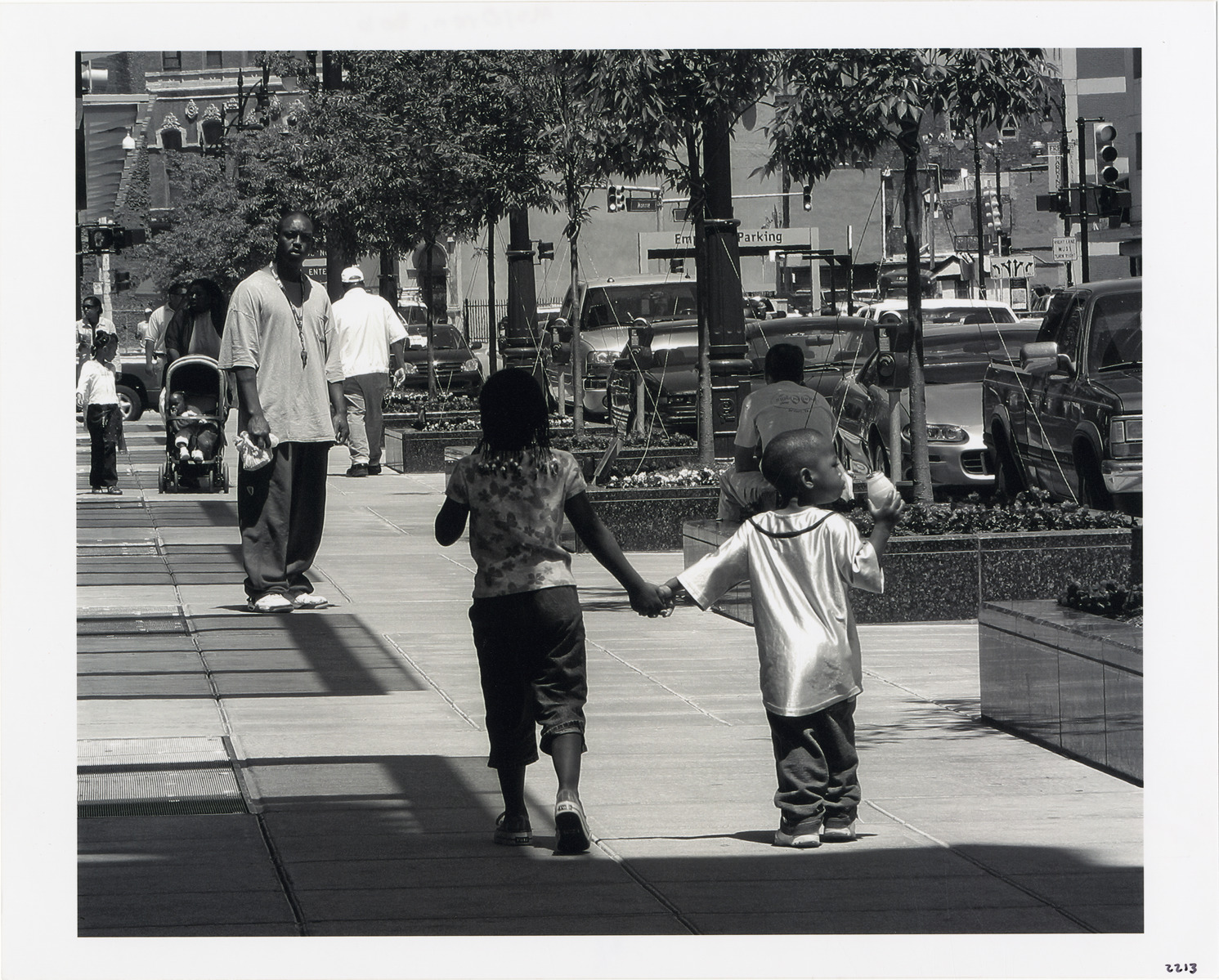 View of a young girl and boy walking on sidewalk along Monroe Avenue. A man, holding a bag, stands in background. Street is lined with trees in planters; cars are parked in street. Label on back: "Walking on Monroe, 6/06. Monroe at Woodward. Photograph by Bob Oren. www.detroit-photos.com. This image is for reference only. The duplication, copying, printing, scanning or any other reproduction of this photograph, in whole or in part, is strictly prohibited without the written authorization of the Detroit Public Library."