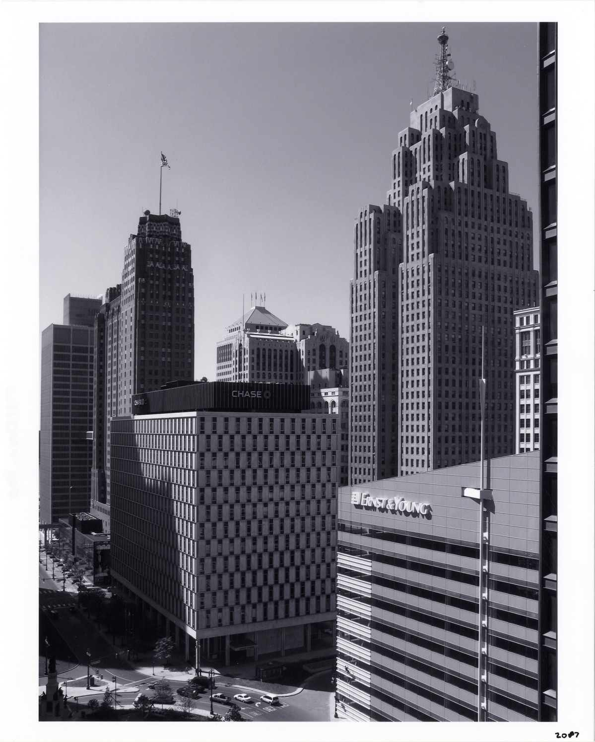 View of the Penobscot Building, Guardian Building, Chase Bank and other commercial buildings. Ernst & Young office building in foreground. Label on back: "Cityscape, west of Woodward, 5/06. Woodward at Campus Martius Park. Photograph by Bob Oren. www.detroit-photos.com. This image is for reference only. The duplication, copying, printing, scanning or any other reproduction of this photograph, in whole or in part, is strictly prohibited without the written authorization of the Detroit Public Library."