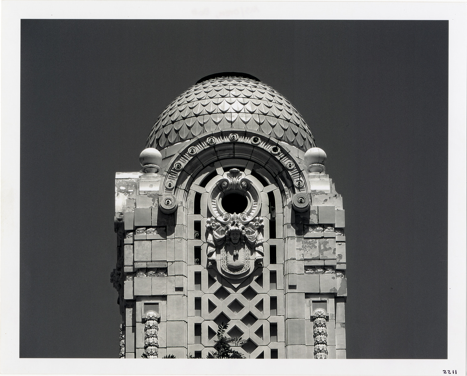 Close-up view of cupola of National Theater, designed by Albert Kahn. Label on back: "National Theater tower, 6/06. Monroe at Farmer. Photograph by Bob Oren. www.detroit-photos.com. This image is for reference only. The duplication, copying, printing, scanning or any other reproduction of this photograph, in whole or in part, is strictly prohibited without the written authorization of the Detroit Public Library."