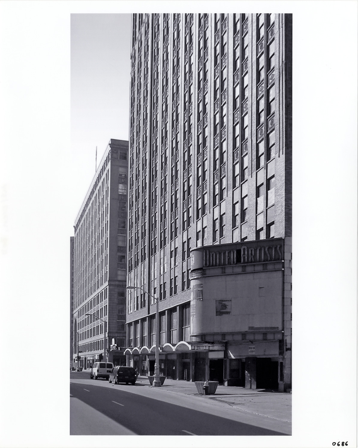 View of marquee on United Artists building. Label on back: "United Artists building marquee, 10/04. Bagley at Grand Circus Park. Photograph by Bob Oren. www.detroit-photos.com. This image is for reference only. The duplication, copying, printing, scanning or any other reproduction of this photograph, in whole or in part, is strictly prohibited without the written authorization of the Detroit Public Library."