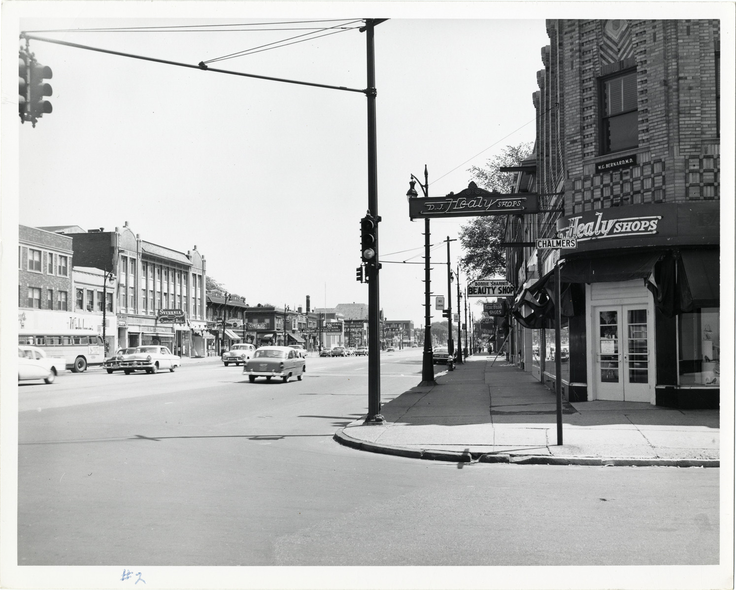 View of businesses near the corner of E. Jefferson Ave. and Chalmers St. in Detroit. D.J. Healy Shops, Bonnie Sharren beauty shop and W.G. Barnard, M.D. on corner in foreground; cars travel in street. Traffic signal on corner. Handwritten on back: "At Chalmers Ave."