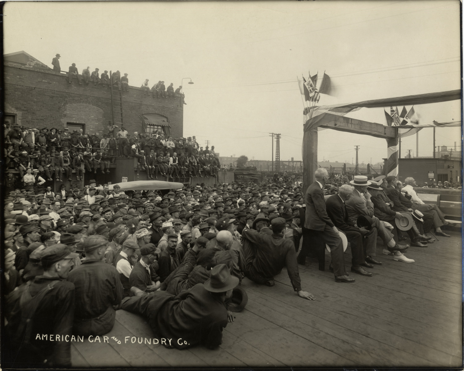 View of crowd of men gathered in front of the American Car and Foundry Co. building. Several men sit on bench on platform in foreground. Printed on front: "American Car and Foundry Co."