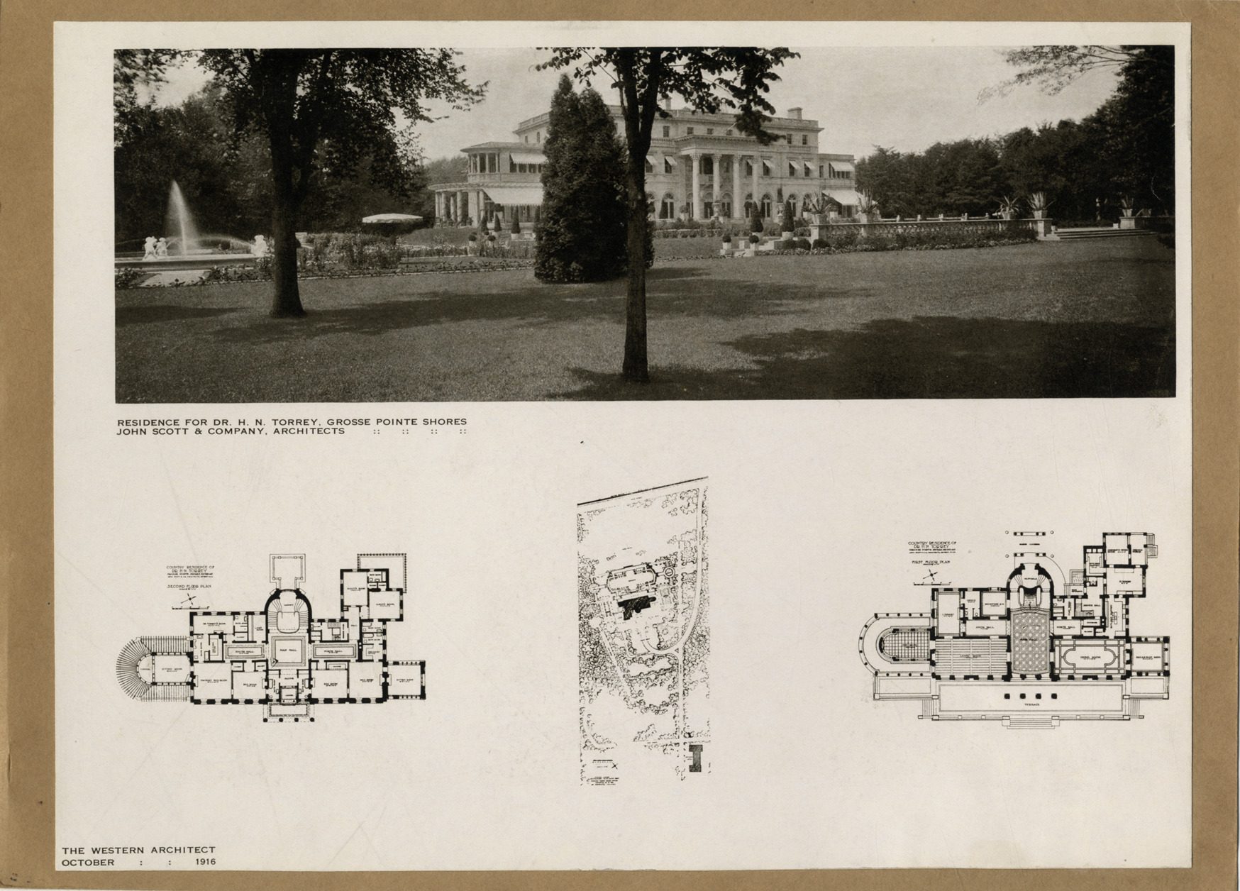View of "Clairview," the residence of Dr. Harry Norton Torrey and Joseph Bernard Schlotman in Grosse Pointe, Michigan, designed by architect John Scott. Fountain in foreground. Architectural plans of first and second floor; also drawing of grounds. Printed on front: "Residence for Dr. H.N. Torrey, Grosse Pointe Shores. John Scott & Company, architects. The Western Architect, October, 1916."