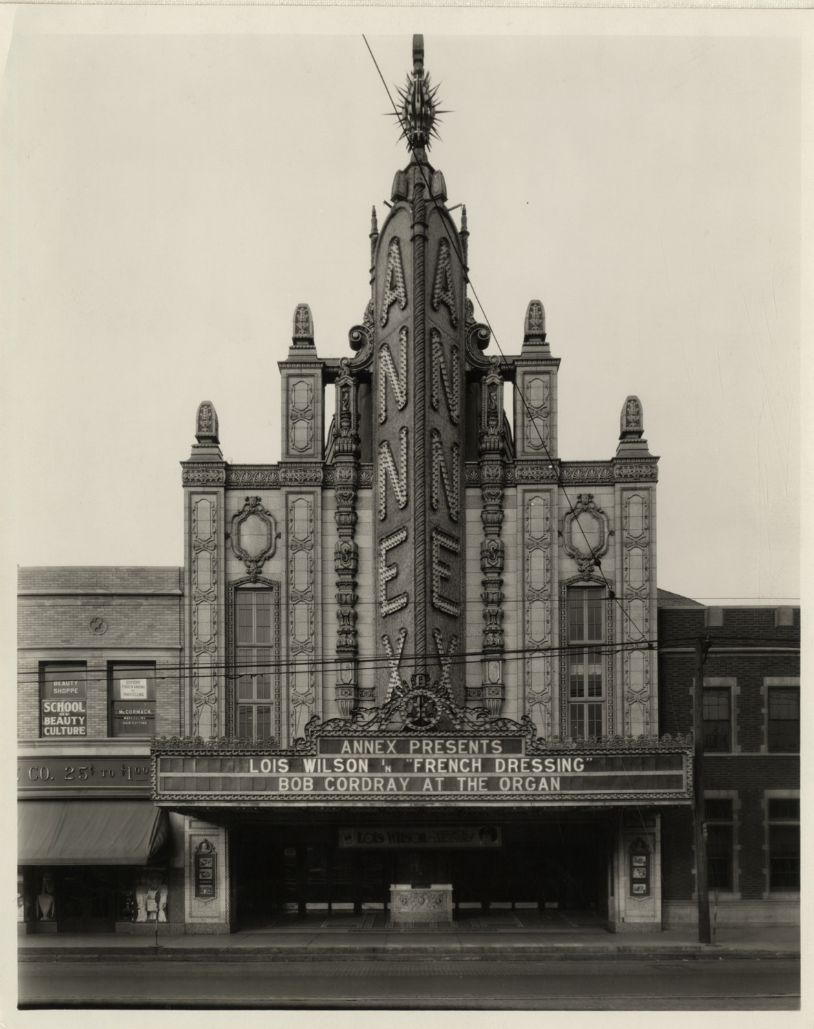 Favorite this☆ Annex Theater Description: View of the Annex Theater, designed by John Eberson. Marquee reads: "Annex presents Lois Wilson in 'French Dressing.' Bob Cordray at the organ." Details Resource ID: bh010310 Subject: Theaters--Michigan--Detroit Motion picture theaters--Michigan--Detroit Marquees--Michigan--Detroit Photographic prints Format: 1 photographic print mounted on fabric ; 10 x 8 in. Member of: Burton Historical Collection Filing Location: D/Theaters-Annex Rights: Physical rights are retained by DPL. Copyright is retained in accordance with U.S. copyright laws.