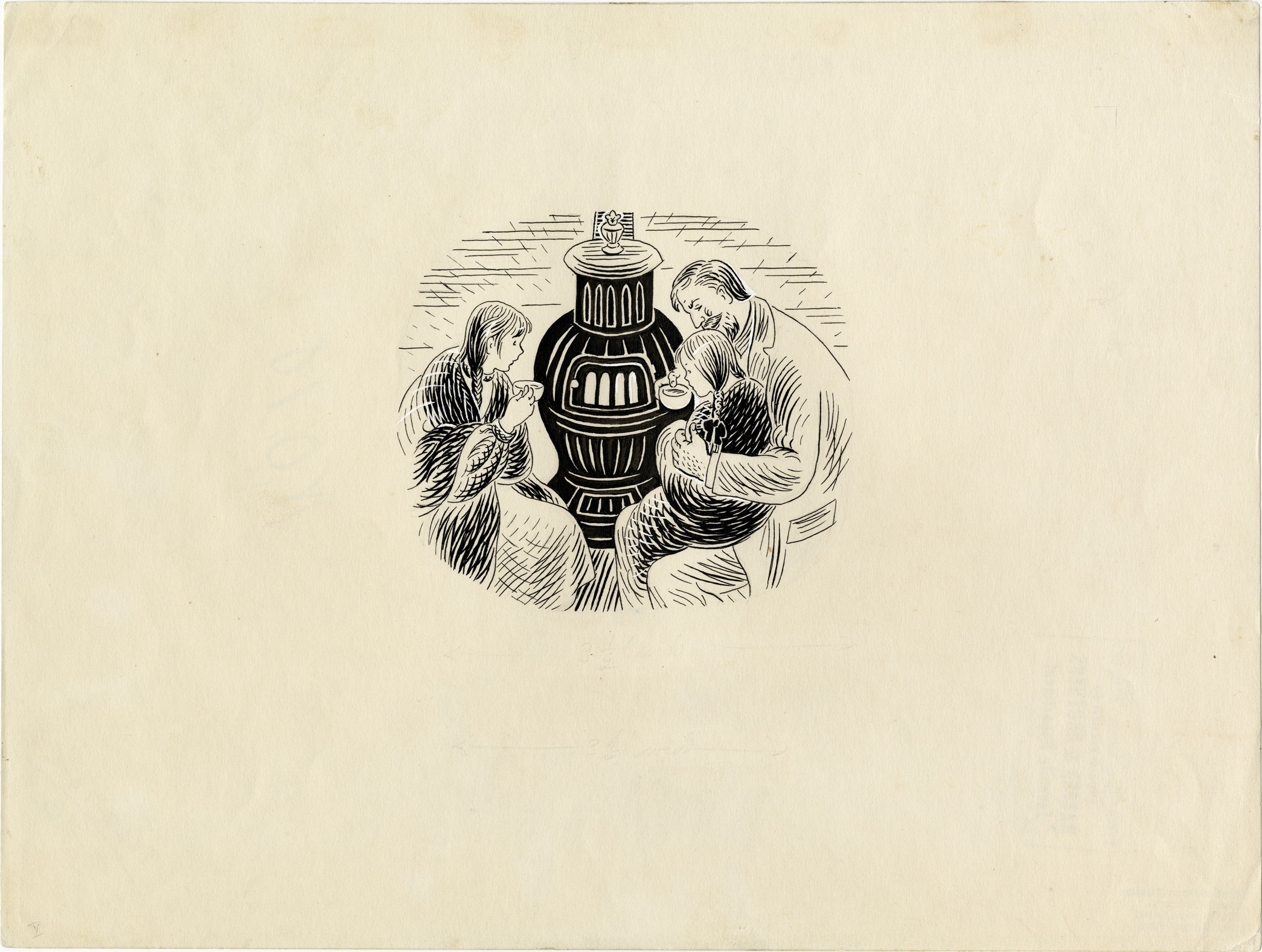 Pen and ink drawing for "The long winter" by Laura Ingalls Wilder. Stamped and handwritten on back: "From 'The long winter.' Please return to Harper & Brothers, Juvenile Dept." Handwritten on back: "No. 10."