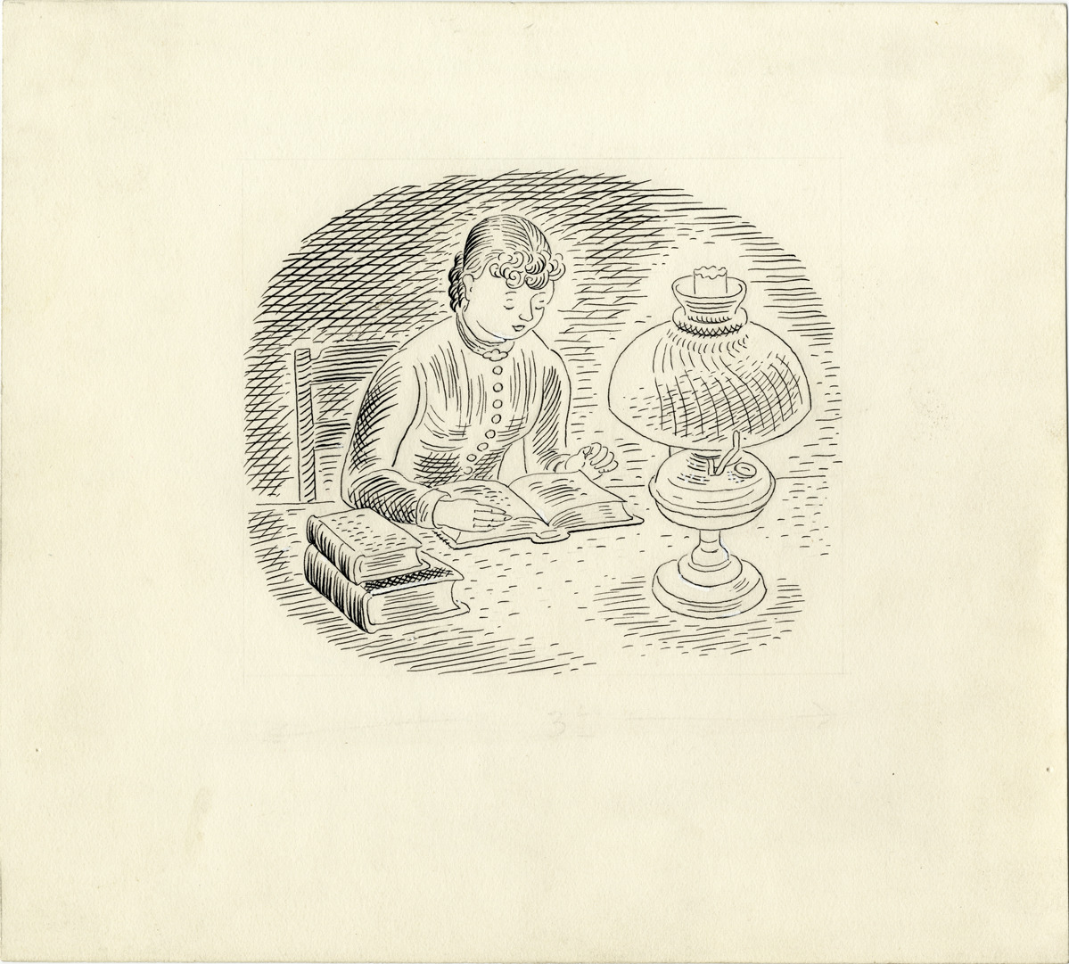 Pen and ink drawing for "These happy golden years" by Laura Ingalls Wilder. Stamped and handwritten on back: "From 'These happy golden years.' Please return to Harper & Brothers, Juvenile Dept." Handwritten on back: "No. 2. Laura set herself lessons."