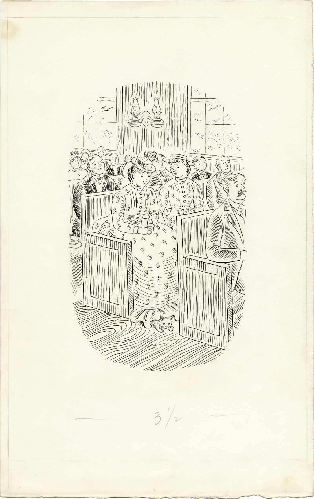 Pen and ink drawing for "These happy golden years" by Laura Ingalls Wilder. Stamped and handwritten on back: "From 'These happy golden years.' Please return to Harper & Brothers, Juvenile Dept." Handwritten on back: "No. 12. The kitten peeped from beneath the ruffle."